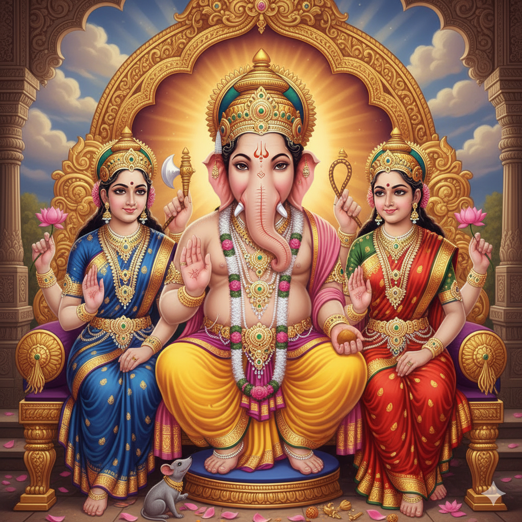 Lord Ganesha’s wives are Riddhi (representing prosperity) and Siddhi (representing intellect and spiritual power).